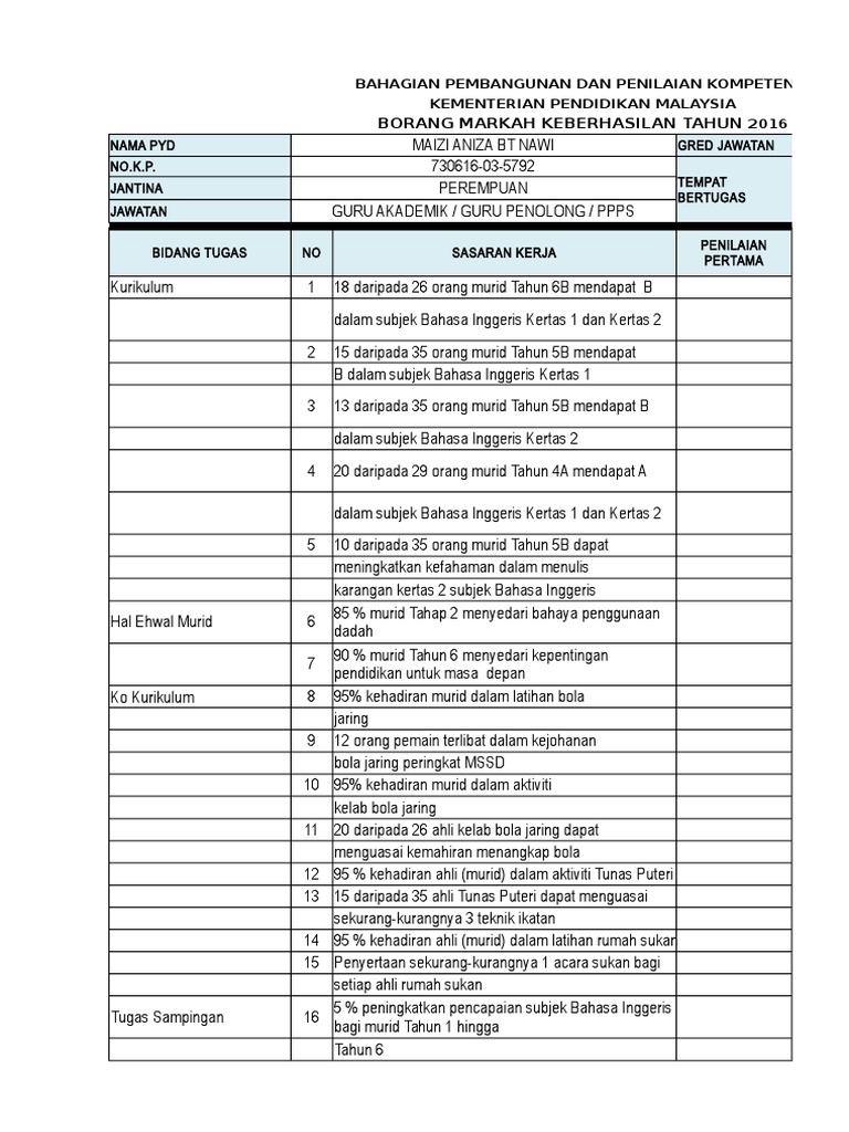 Contoh Keberhasilan Pengetua Guru Besar PBPPP 2020 dikongsikan untuk dijadikan rujukan kepada Pegawai Penilai PP dan juga Pegawai Yang Dinilai PYD yang terdiri. ENCIK RAHIMIN ABD MUES. BAHAGIAN PEMBANGUNAN DAN PENILAIAN KOMPETENSI KEMENTERIAN PENDIDIKAN MALAYSIA BORANG MARKAH KEBERHASILAN.